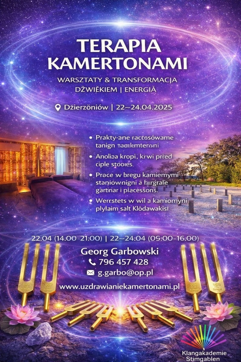 Zaproszenie na warsztaty terapii kamertonami 25.02.2026 14:00-21:00 26.02.2026 09:00- 16:00, 27.02.2026 09:00- 16:00. Dzierzoniow.